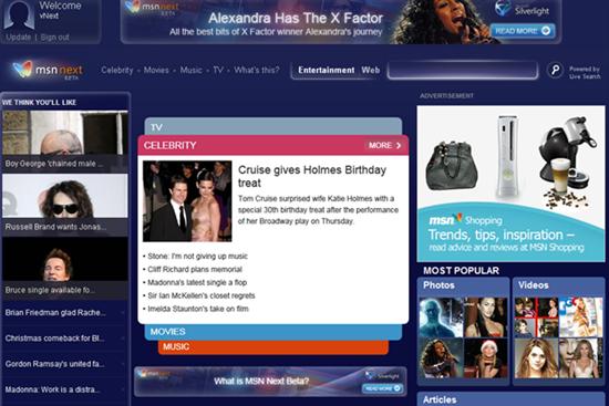 MSN英国站近日开始了对第13版本MSN主页界面的测试,主要新增了Silverlight技术,这种动态的视频技术使得新的MSN主页界面非常的华丽炫目。