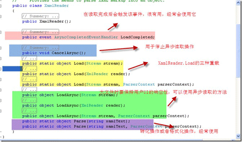 XamlReader类除了定义Load的实时加载之外,也定义了异步方法,可以异步解析XAML中的内容。我们可以在XamlReader对象的实例里调用它们。如果在读取一个大文件时要保持用户UI的响应性,就可以使用异步读取的方法。和异步读取方法匹配的还有一个CancelAsync方法,用于停止读取操作。XamlReader 还定义了LoadCompleted事件,在读取完成后会触发该事件,那么我们就可以把读完后要做的事情都在这里进行处理。