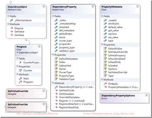 利用VS自带的类图,可以看到刚才我们实现的这个依赖属性类及类之间的关系图: