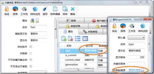 如下图,在制造业企业中,零部件属于一种特殊的物料,在建模的时候,将part建模为material对象类型的子类型。下图显示如何在属性标签页对零部件的属性进行扩展,例子中添加了零部件的“材料”,零部件的“重量”等属性。