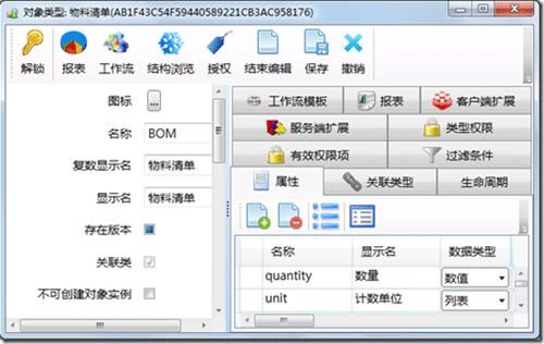 在系统中创建“物料”对象类型,左边可以指定对象类型的基本属性,右边有一系列标签页,可以定义类的属性,类的关联等内容。创建一个类,系统会自动生成一些基本属性,如ID,创建人,创建时间,修改人,修改时间等。在属性标签页可以添加物料的自定义属性,如物料的“编码”、“名称”等。在数据库中将自动按模型生成表Material,用来存储“物料”对象类型的实例数据。