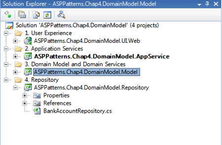 创建一个新的解决方案,命名为ASPPatterns.Chap4.DomainModel,并且添加如下的项目: