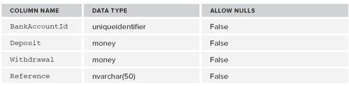 下面就开始创建保存数据的数据库,和以前一样,为了演示的作用,我们在Web project中添加一个名为BankAccount.mdf的数据库,并且建立如下的表: