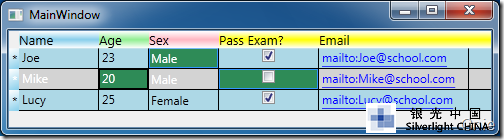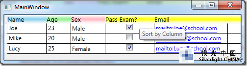 其效果如下图所示,Name、Age、Sex 列会按各自的样式显示。未定义样式的Pass Exam 和Email 列将按<DataGrid.ColumnHeaderStyle>全局定义显示,并且当鼠标移置到这两列上方时会有"Sort by Column"提示信息。