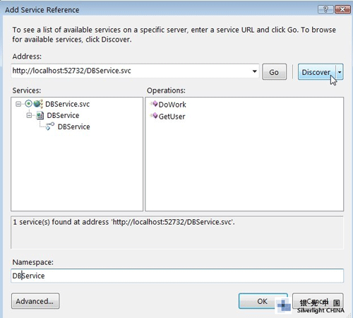 14. 在弹出窗口中,点击"Discover",查找本地WCF service。在地址栏会自动搜索到本地的Service引用,在Services树形框中我们可以看到,在服务器端建立的DBService.svc,双击打开,可以看到,我们建立的GetUser函数,以及默认的DoWork函数。修改下面的命名空间为"DBService",方便调用。
