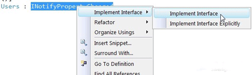VS2008将自动生成Users类代码,在类命名前添加数据契约属性[DataContract()]。 为了能够使绑定数据返回修改通知,这里需要继承INotifyPropertyChanged接口,该步骤不添加对本教程也没有影响,为了以后例程代码完整性,这里我继承了该接口。在接口上点击右键,生成代码。