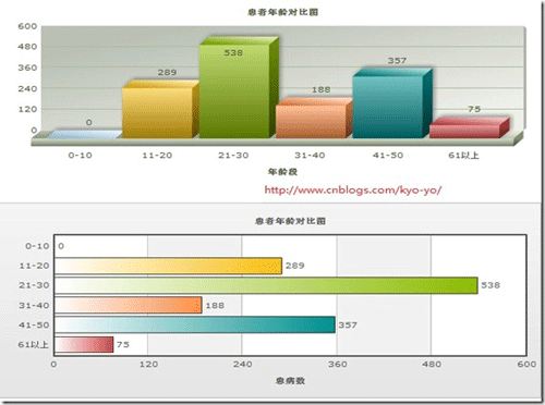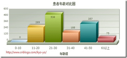2 chart_YearAgeChartTable.setDataXML("<chart caption='患者年龄对比图' formatNumberScale='0' xAxisName='年龄段' yAxisName='患病数'><set label='0-10' value='0' /><set label='11-20' value='289' /><set label='21-30' value='538' /><set label='31-40' value='188' /><set label='41-50' value='357' /><set label='61以上' value='75' /><styles><definition><style name='titlefont' type='font' size='14'/><style name='axisfont' type='font' size='12'/></definition><application><apply toObject='Caption' styles='titlefont' /><apply toObject='xAxisName' styles='axisfont' /><apply toObject='yAxisName' styles='axisfont' /><apply toObject='DATALABELS' styles='axisfont' /></application></styles></chart>");