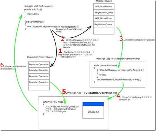 WPF也是通过BeginInvoke来解决的,而Wpf的BeginInvoke是在Dispatcher上面暴露了,因为整个消息系统都是Dispatcher在协调。从上面图可以看出Dispatcher在调用BeginInvoke之后所经历的流程,最终是什么时候Foo()被真正执行的。