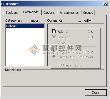 这只是一个空壳子。下面我们加入菜单:双击dxBarManager控件,打开Commands页,在右侧右键点击鼠标,出现如图弹出菜单。选择其中的Add。