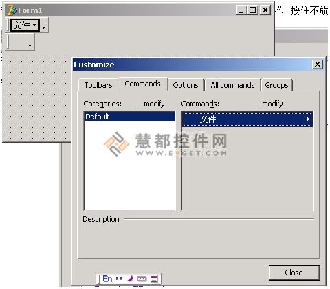 但是,它并没有加入到Form上。用鼠标左键点中上图中的“文件”,按住不放,将其拖放到Form1的MenuBar中:(在拖动的过程中,鼠标的形状为一个小矩形右下角一个x,当移动到能够放置的位置时x变成+表示能够加入)