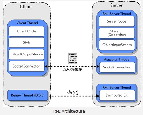 RMI是J2EE应用的一个标准协议。像它的名称暗示的一样,设计时就是为了调用远程Java虚拟主机上的对象提供的方法。对象在服务端被暴露出来,这时客户端就可以通过代理调用这个对象。同样的服务端对象被多个线程使用。线程池被RMI基础设施管理。通信通过TCP/IP被处理,并且使用JRMP或针对RMI的基于IIOP GIOP(CORBA协议)的协议。应用服务端也提供自己的属性协议来优化其性能。如服务端的引用需要管理一样,RMI基础设施也提供了垃圾回收器来管理引用。这个分布式垃圾回收器(DGC)本身也使用RMI协议来管理服务器端的对象生命周期。除了客户端和服务端很强大,RMI还有一些其他的实现。关于RMI的详细介绍及应用请参考51CTO之前的文章《用RMI实现基于Java的分布式计算》。