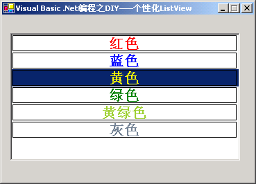 | Private sData ( ) As String = {"红色" , "蓝色" , "黄色" , "绿色" , "黄绿色" , "灰色"} '此数组是定义ListBox中各项的名称 Private sColorData ( ) As Object = {System.Drawing.Color.Red , System.Drawing.Color.Blue , System.Drawing.Color.Yellow , System.Drawing.Color.Green , System.Drawing.Color.YellowGreen , System.Drawing.Color.SlateGray} '此数组是定义各项名称对应的颜色 |