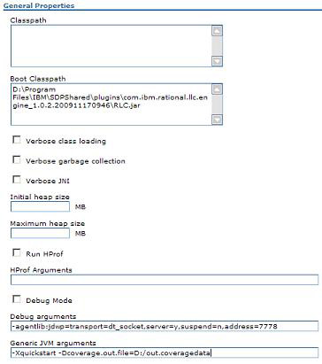 11.在Generic JVM arguments中,添加-Dcoverage.out.file={output file} JVM论断。如上面所述的那样,该论断指定了应该将输出的统计数据保存在什么地方。