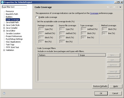 选择图2中的Enable code coverage复选框以激活项目的代码覆盖率,并评价覆盖下项目的类。您还可以使用该窗格来定制可接受的覆盖率层次。接下来描述了组合的支持层次: