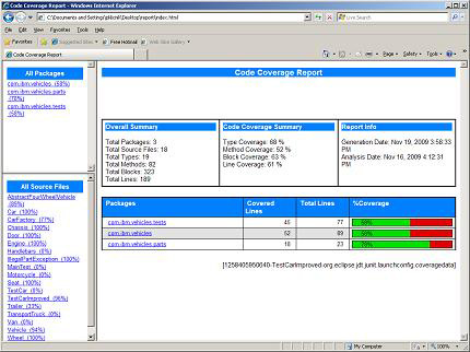 HTML报告显示了基于Eclipse报告所提供的相同类型的信息,但是呈现的格式却是HTML的。这些报告能够发挥一定程度的作用,因为它们为在独立于Rational Application Developer之外去分析覆盖率数据提供了一种有效的方法,您可以与团队的其他成员一起分享,或者将其发布到一个网站上以方便查看。