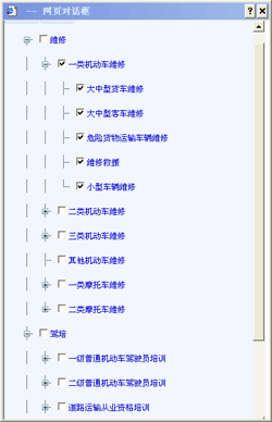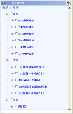 在弹出的对话框中,放置的TreeView控件,一个带有CheckBox,可以方便用户选择,并且具有级联(通过Javascript实现,减少Post回发),另外由于内容比较多,我设置了展开的级别层次。