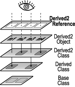 既然你有一个Derived2对象,可以用任 何一个Derived2类型的变量去引用它。如图1所示,Derived, Base和IType都是Derived2的基类。所以,Base类的引用是很有用的。图3描述了以下语句的概念观点。