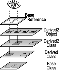 上文中声明了 derived2这个对象,它是Derived2类的。图2种的最顶层把Derived2引用描述成一个集合的窗口,虽然其下的Derived2对象是可 见的。这里为每个Derived2类型的操作留了一个孔。Derived2对象的每个操作都去映射适当的代码,按照上面的代码所描述的那样。例 如,Derived2对象映射了在Derived中定义的m1()方法。而且还重载了Base类的m1()方法。一个Derived2的引用变量无权访问 Base类中被重载的m1()方法。但这并不意味着不可以用super.m1()的方法调用去使用这个方法。关系到derived2这个引用的变量,这个 代码是不合适的。Derived2的其他的操作映射同样表明了每种类型操作的代码执行。