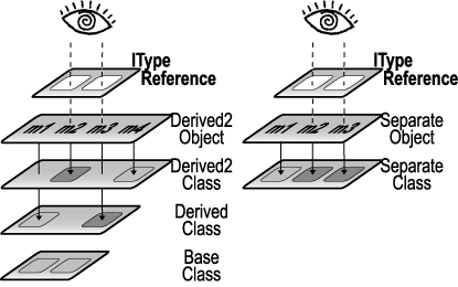 注意图5中的Derived2和Separate对象的对m1()的映射方法。如前所述,每一个对象的接 口都包含方法m1()。但却没有办法用这两个对象使方法m1()表现出多态的行为。每一个对象占有一个m1()方法是不够的。必须存在一个可以操作 m1()方法的类型,通过这个类型可以看到对象。这些对象似乎是共享了m1()方法,但在没有共同基类的条件下,多态是不可能的。通过对象的接口来看多 态,会把这个概念搞混。