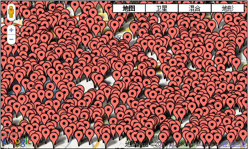 2、可用性问题。地图上Marker越多,就会越不宜用。当然这还取决于Marker的密集度。如果这些Marker都很分散,关系不是很大。如果很密 集,用户就看不到地图上的东西了。如下图:显示10个、100个问题不大。当显示1000个的时候,地图被这些Marker占据了。