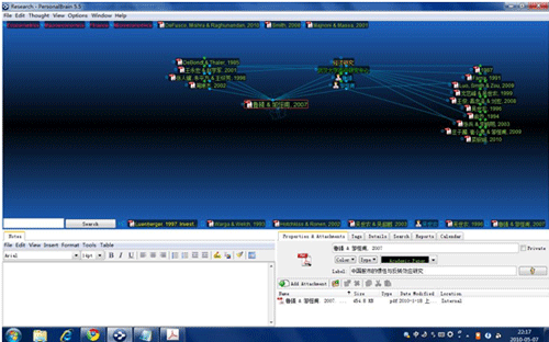 可以看到,目前的关注焦点在 Hotchkiss & Ronen, 2002 这篇文章上,这在 PersonalBrain 中被称为一个 Thought。每个 Thought 都可以添加无数附件,我只把这篇文章的 pdf 文件放入了附件,只要点击 Thought 内的 pdf 图标,论文就会自动打开。左下角是这个 Thought 的附注,支持富文本格式(RTF),我读这篇文章后简单地记录了一些当时的想法。