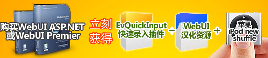 凡在活动期间,购买WebUI Studio Premier或WebUI Studio ASP.NET,即可获得价值¥5000元的一套+价值¥1990元WebUI Studio .NET汉化资源一套+价值¥400元苹果iPod new shuffle一个。