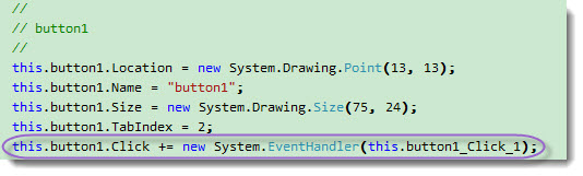举一个简单的例子,.NET中经常使用的控件Button,当我们把Button 控件 drap and drop到界面,然后双击界面的Button我们发现程序中自动生成了一个响应Button的事件方法,然后我们给事件方法添加Code之后,当我们点击该Button就响应该方法了,但我们没有看到代码中有任何的委托和事件之类的定义,其实这些.NET都已经做好了。我们可以查看如下文件。