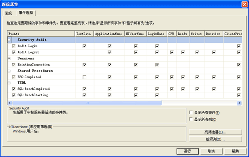 SQL Profiler是最容易被忽视的工具,而这个工具是数据库性能优化一个非常强大的工具,它与Management Studio在SQL Server安装时都会绑定在一起,选择新建跟踪,然后在跟踪属性中选择相应的事件列,一般选择CPU、Reads、Writes、Duration、StartTime、EndTime即可,它们对应了在物理上SQL语句对CPU的占用、对硬盘读写的次数和起止时间,通过它可以很直观地看出影响SQL性能的地方。