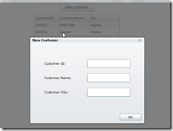 程序运行后当用户单击 New Customer 按钮时,就会弹出一个子窗体,用户输入Customer Id、Customer Name、Customer City 后单击 OK 按钮就会在主页面的客户列表中显示出刚才输入的客户信息。下面是本示例具体的实现。