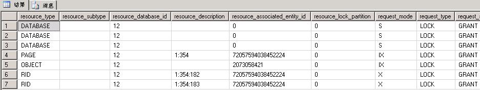 从上图中看出这个快照中有:三个数据库共享锁、一个页级意向排他锁、一个表级意向排他锁、两个行级排他锁。