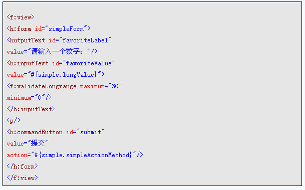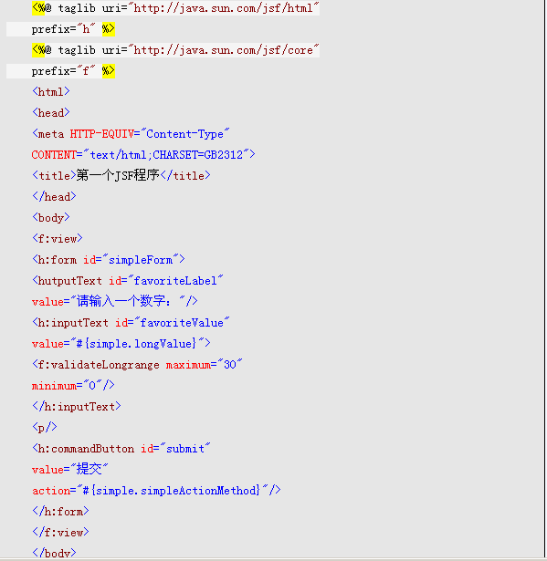 /f:view 标签预示着JSF的开始,而它的下一个标签form将建立一个HTML Form.而outputText标签相当于HTML中的label组件。inputText标签相当于HTML中的textField组件。而 commandButton标签相当于HTML中的submit按钮。