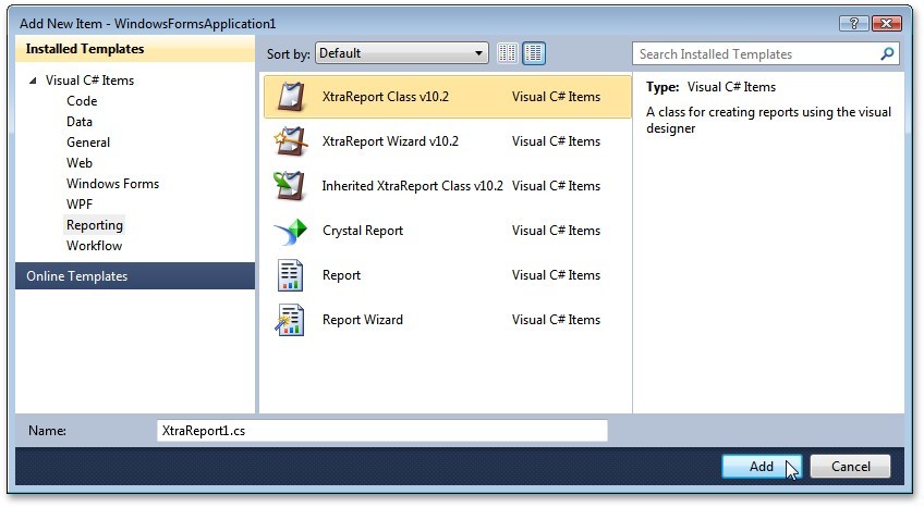4、在此对话框中,选择 XtraReport Class v10.2 项,并且单击 添加 按钮。 这样将把一个空白新报表添加到应用程序中。