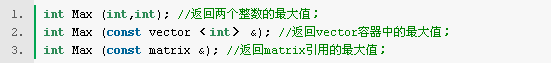 上面的三个函数都可以大概地说成判断一组数中的最大值,对于函数的用户来说,他们并不关心函数定义的细节,也就是说他们不关心判断两个整数的大小和判断数组(vector容器)数的大小应该使用不同的函数,而对于程序的设计者来说这可是不得不想到的。程序员必须记住并查找每个函数名。而函数的重载把程序员从这种问题的复杂性中解放了出来,C++提供了这种支持。上面的三个比较大小的函数可以定义成: