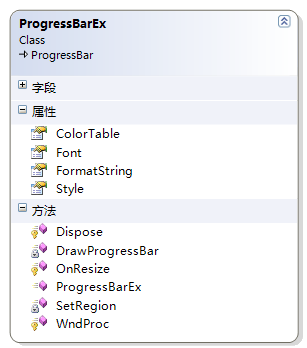 为了让ProgressBar控件可以显示进度完成的信息,添加了一个属性:FormatString来格式化进度条完成信息,通过这个属性,可以定义自己需要显示什么样式的信息,默认为:{0:0.0%},即显示:50.0%。来看看类视图: