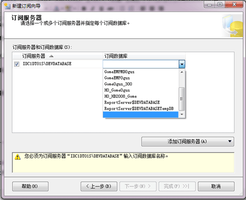 4、选择订阅服务器上的存放同步过来的数据的一个或者多个目标数据库。如下图: