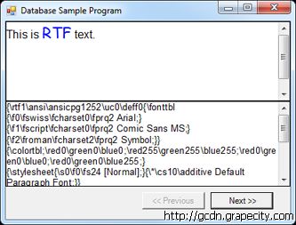 该示例程序包含一个Form和两个Text Control控件。两个Text Control控件显示的是数据库中的同一条记录,上面的控件显示的是格式化文本,下面的控件显示的是相应的RTF源码。点击【Next】按钮将保存当前 记录,并显示下一条记录。
