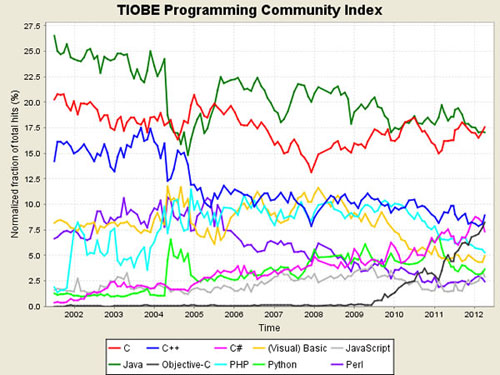 2012年 4 月编程语言排行榜前 10 位的长期走势图: