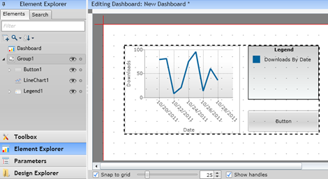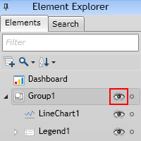 当你设计了一个有很多控件和重叠组的仪表盘时,你可以在设计时暂时隐藏某些组,以便你可以集中精力在当前需要操作的元素上。要隐藏某个组,单击Element Explorer右边的Toggle Visibility按钮,如图所示:
