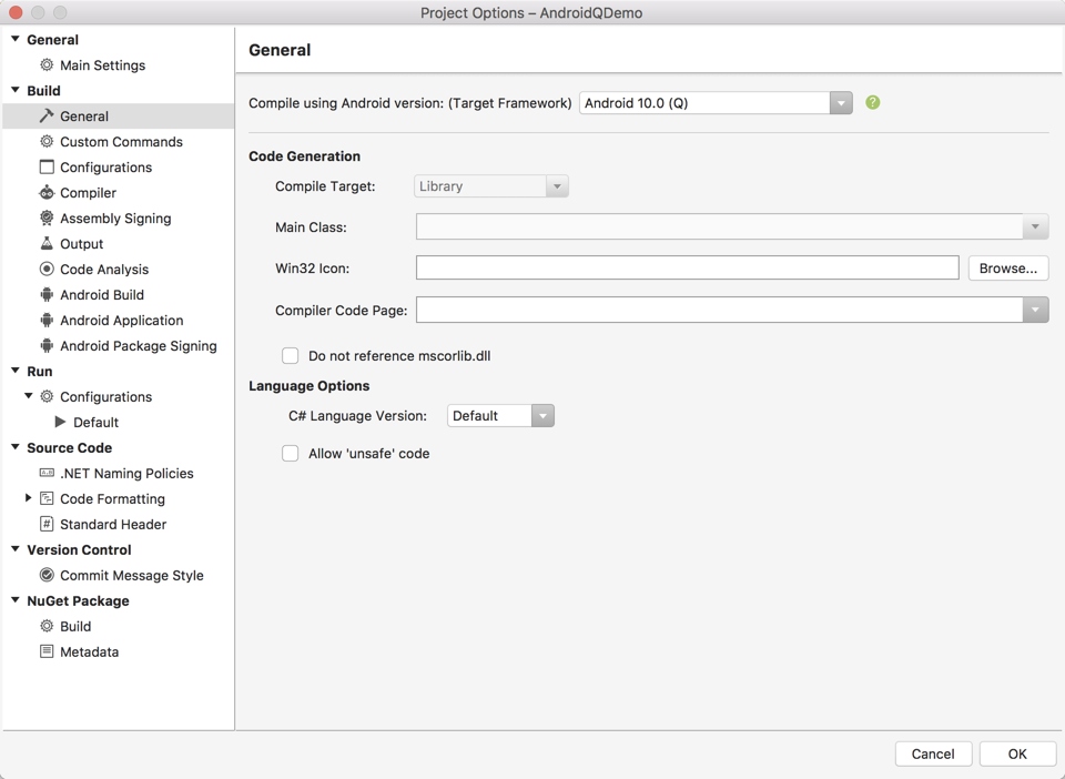 现在可以在Xamarin.Android中使用Android 10 API。 要开始针对Android 10进行开发,可将“使用以下Android版本编译: (目标框架)”设置为Visual Studio for Mac项目属性页Build>General选项卡下的“Android 10.0 (Q)” 。Android 10的新增功能包括: