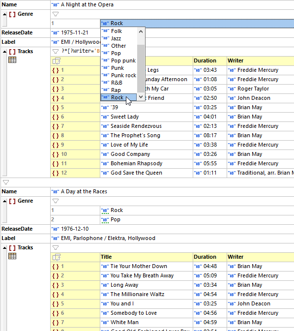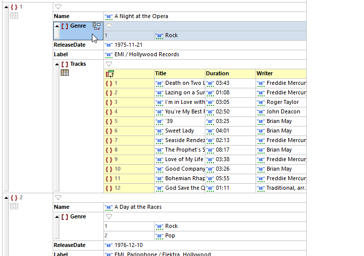 JSON Grid中的每个表都包含一个过滤器,可让您操纵对象和数组的显示。例如,在上面的屏幕截图中,过滤器已应用于数组,因此仅显示由Brian May编写的那些轨道。通过单击filter图标,可以轻松地在已过滤和未过滤的单元格之间切换。保存文件时,过滤器将存储在元数据中,以供以后查看。它们不会影响文档的内容。