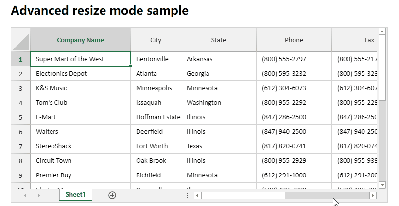 在SpreadJS v13.0中,Advanced Resize添加了一种调整大小的方法onlyNextTo。它与一般调整大小的方式不同,使用onlyNextTo调整大小只会改变当前列/行和下一个可见列/行的大小。