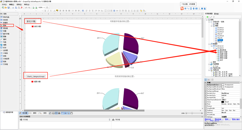 我们使用ActiveReports报表后,开发图表更加简单方便,只需拖拽一个图表控件,然后给图表数据分组、类型分组、子分组都选择好数据源里提前配置好的字段即可,简单易用,完全不需要再考虑怎么绘制各种图形、文字、直线,而且这个图表控件有各种可视化展示类型: