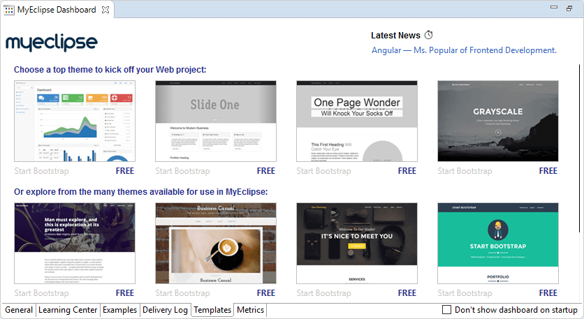 Dashboard视图将在MyEclipse透视图中自动打开。要在启动时禁用仪表板,请选中“Dashboard”视图底部的“不要在启动时再次显示此Dashboard”复选框。使用