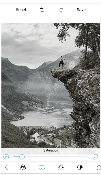 饱和度是颜色的强度,其值介于-100到100之间。当值为“0”时,表示饱和度效果没有变化,并且图像以其原始颜色显示。当值为“-100”时,图像将为黑白色。如果值为“100”,图像颜色将过于饱和。要将饱和度效果应用于图像,可使用工具栏中的“饱和度”选项,或使用以下XAML/C#代码。