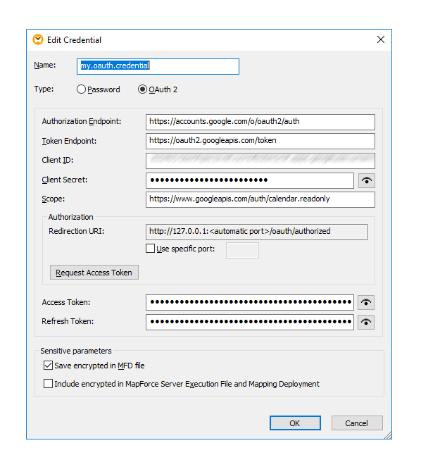 可以借助凭据对象将OAuth授权详细信息传输到其他执行环境,例如MapForce Server和FlowForce Server。