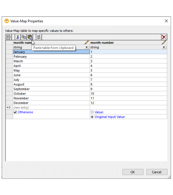 使用值映射组件,可以使用预定义的查找表将一个值替换为另一个值(例如,将1、2、3替换为1月、2月、3月)。从Altova MapForce 2020开始,可以将来自外部源(例如CSV或Excel)的表格数据(key-value对)粘贴到Value-Map表中。