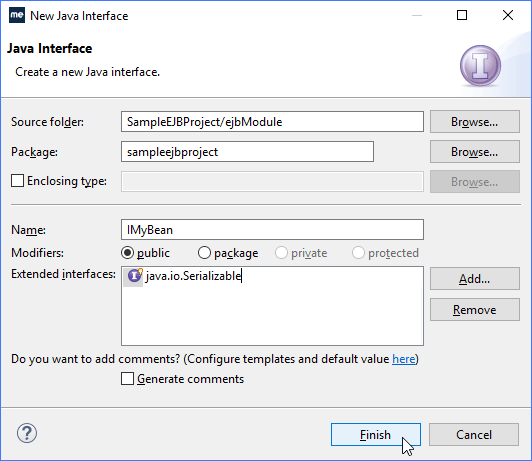 在“Name”字段中输入MyBean,选择“Remote”和“Local”复选框生成本地和远程接口版本,然后单击“Finish”。