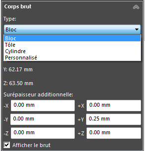 在我们的情况下,将切割一块钢材以获得所需的零件。如果需要,我们可以设置过度厚度,并且可以显示毛坯以在加工之前查看初始块。
