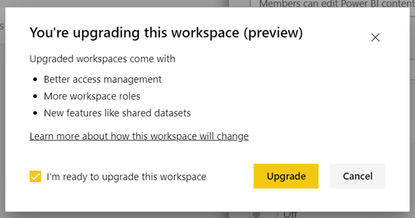 3、查看对话框信息。如果已在工作区中发布或安装内容包,则会收到警告。准备就绪后,选中“我已准备好升级此工作区”,然后选择“升级”。