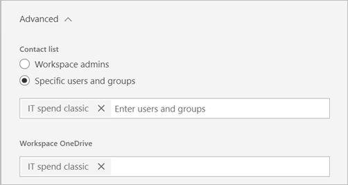 2、在“高级”设置中将工作区“联系人列表”配置为从中升级工作区的Office 365 Group。你可以将更多的用户或组添加到联系人列表,或将其切换到工作区管理员。